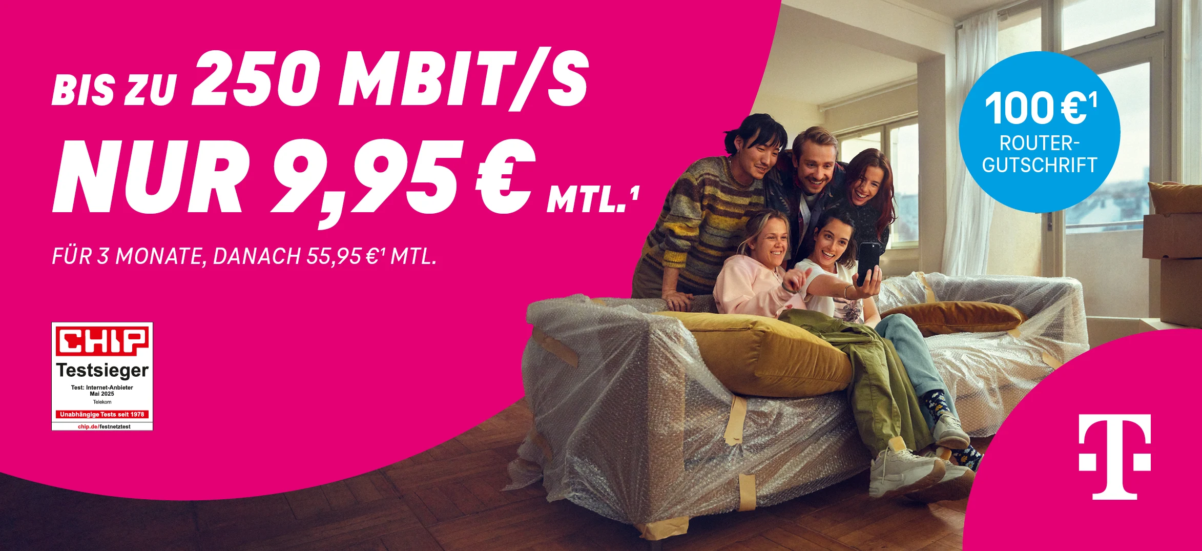 1) Aktion gilt bis 02.02.2026 für Breitband-Neukunden, die in den letzten 3 Monaten keinen Breitbandanschluss bei der Telekom hatten. MagentaZuhause XL kostet in den ersten 3 Monaten 9,95 €/Monat, danach 55,95 €/Monat. Bei Miete eines Routers im Endgeräte-Service-Paket (ab 6,95 €/Monat) erfolgt eine Router-Gutschrift i. H. v. 100 €. Hardware zzgl. 6,95 € Versandkosten. Einmaliger Bereitstellungspreis für neuen Telefonanschluss 69,95 €. Mindestvertragslaufzeit für MagentaZuhause 24 Monate, für den Router 12 Monate. Alle Preise inkl. der gesetzlichen MwSt. MagentaZuhause XL ist in vielen Anschlussbereichen verfügbar.